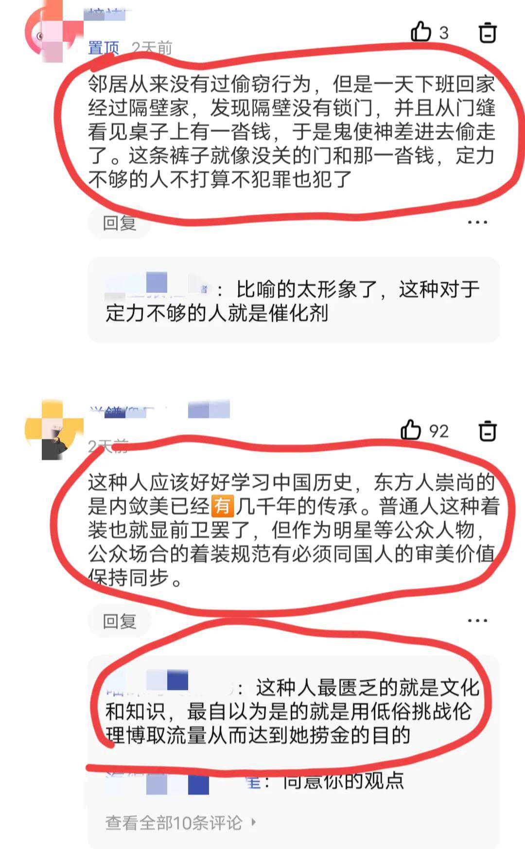 甚至还有网友打了一个这样的比喻:“邻居从来没有过偷窃的行为,但是有一天他下班回家经过隔壁家,发现隔壁家门没上锁,且从门缝看见桌子上有一沓钱,于是鬼使神差的偷走了,这条裤子就像没关的门和那一沓钱,定力不够的人遇到这种催化剂即使不打算犯罪也犯了,这种人最匮乏的就是文化和知识,最自以为是的就是用低俗挑战伦理博取流量,从而达到她捞金的目的”。