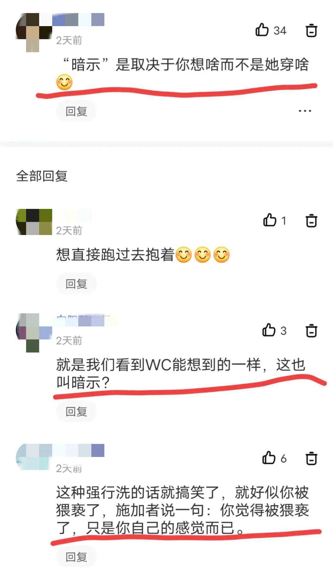 网友甚至还阴阳怪气的嘲笑别人:“暗示”是取决于你想的啥,而不是她穿的啥,心脏看啥都是脏的。