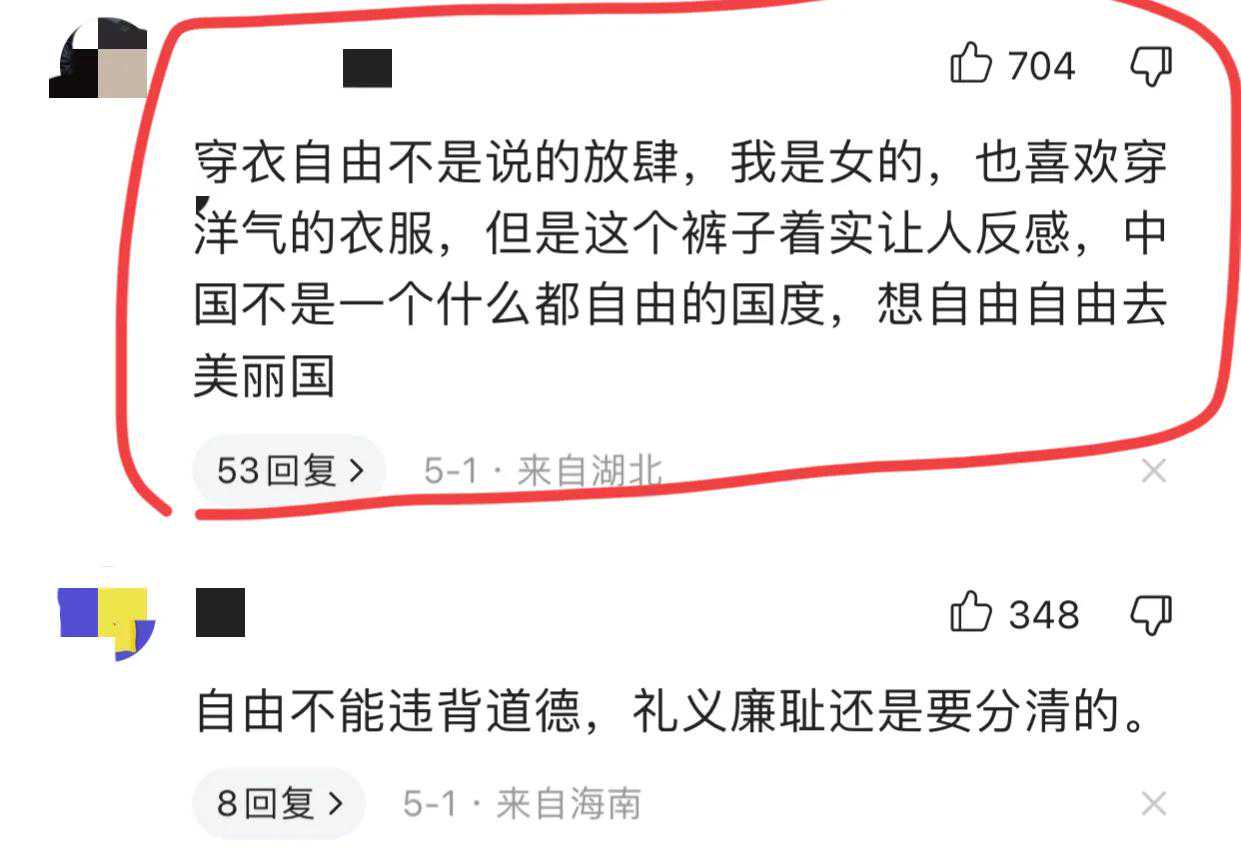 但大部分网友则表示穿衣自由却不代表擦边自由,不要总是整新时代那一套,新时代也不能不要脸。