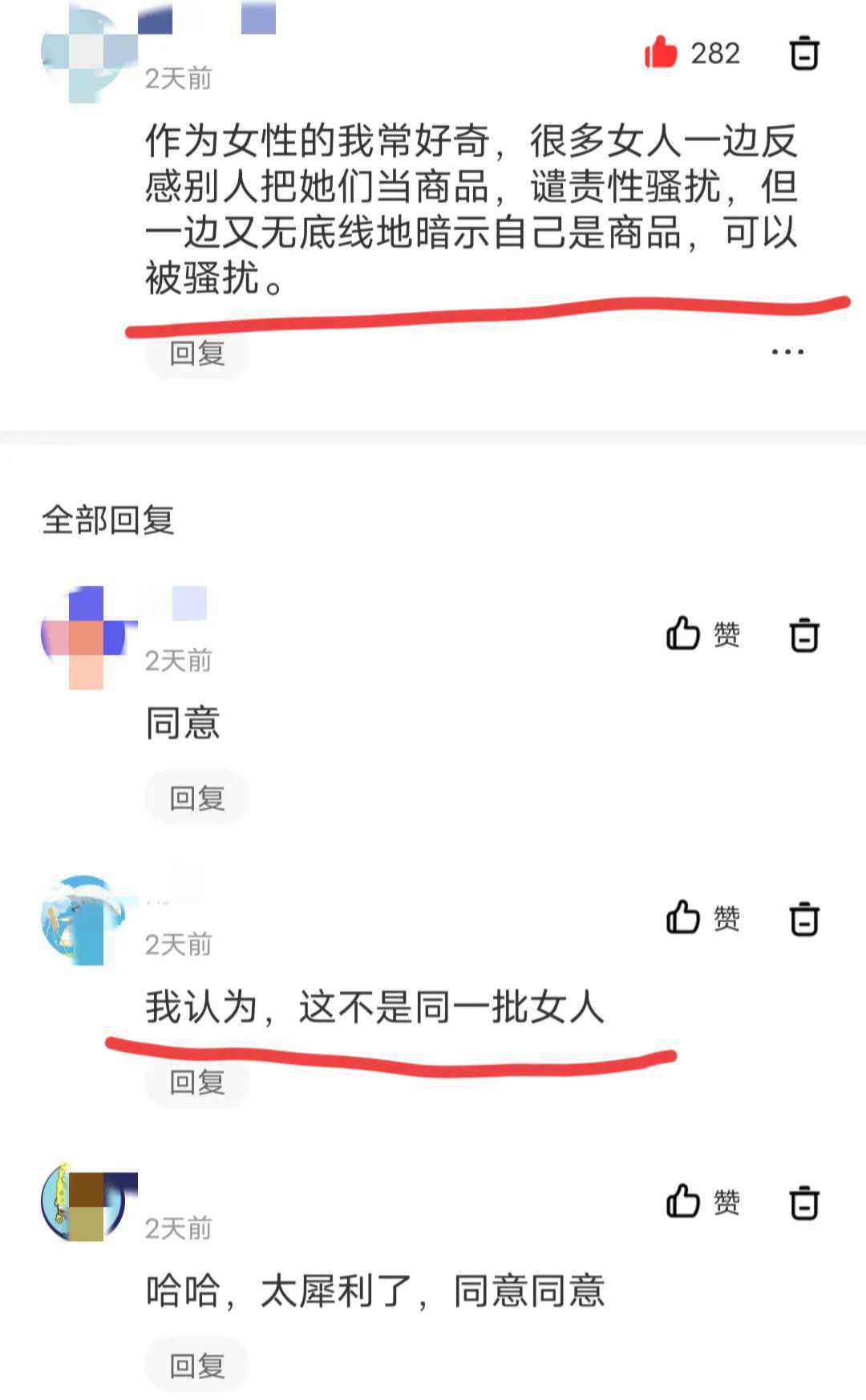 对此有网友评价道:“作为女性的我时常好奇。很多女人一边反感别人把她们当商品,谴责骚扰,但一边又无底线地暗示自己是商品,可以被骚扰”。
