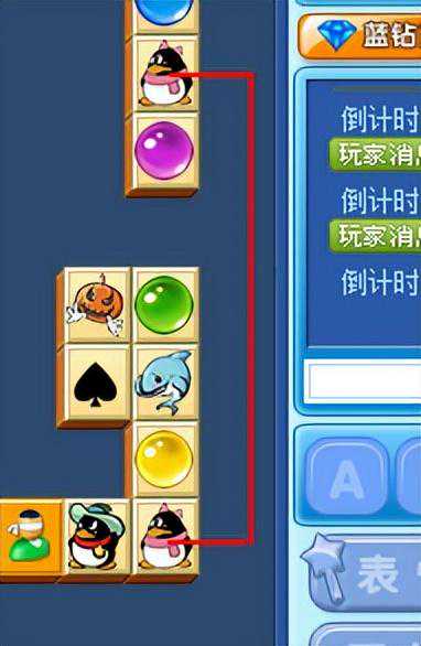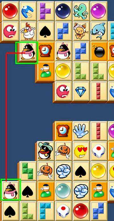 拐1个弯,如果两个一样的方块,其中一个的X轴和另一个Y成90度,并且中间没有任何方块,可以消,如图