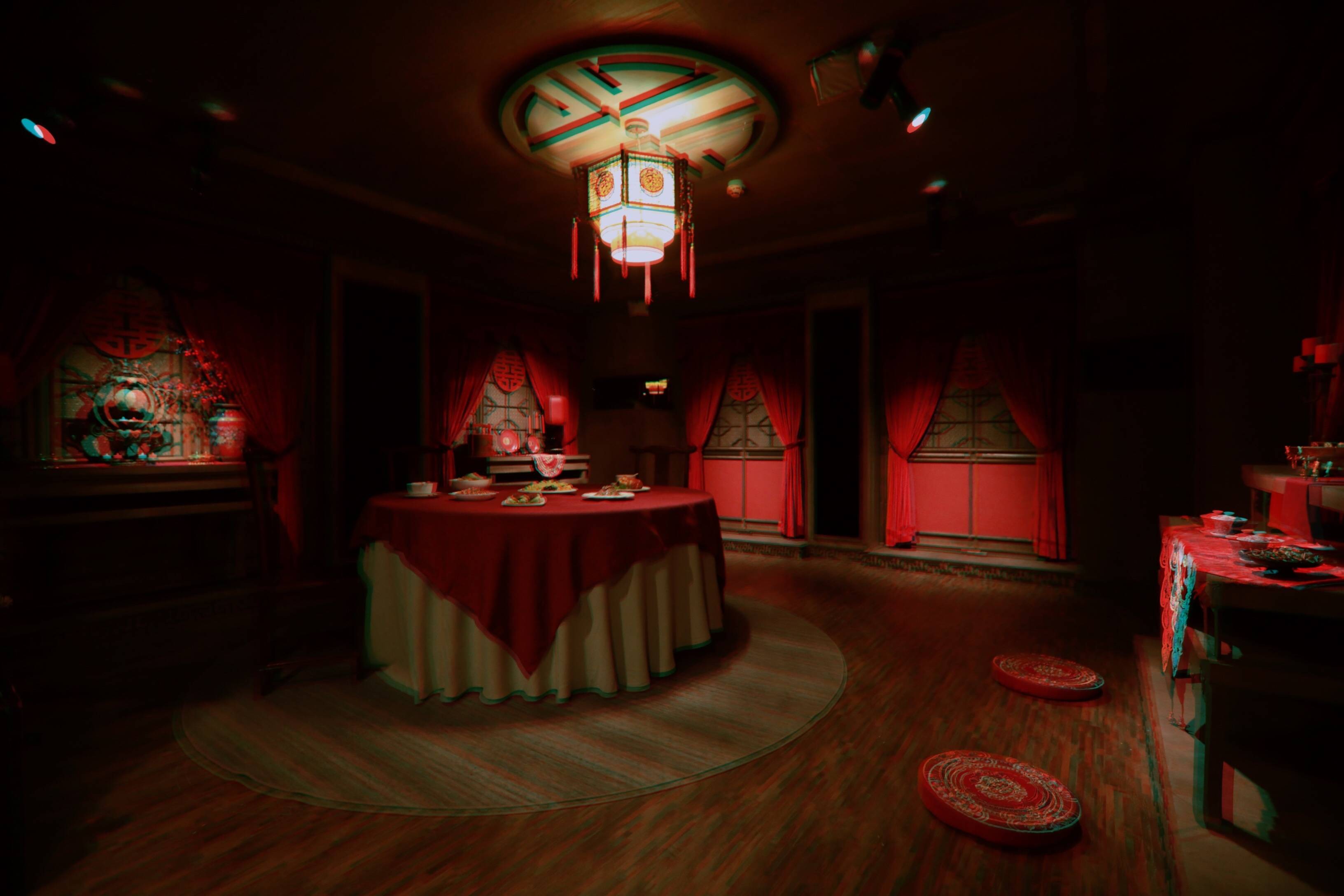 开关没摸到,npc就已经安排上,红光乍现,一穿旗袍的歌女拿把红扇又唱又跳。