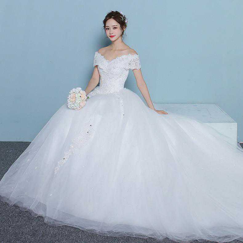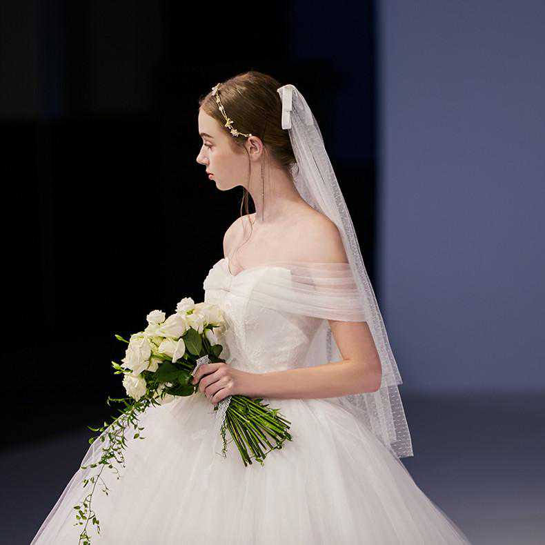 用剪裁用工艺制作出一条富有个性的梦幻婚纱,给人一种公主般的高贵感,一字肩拖尾细节更是为时尚加分不少,穿上它妥妥地成就完美婚礼。