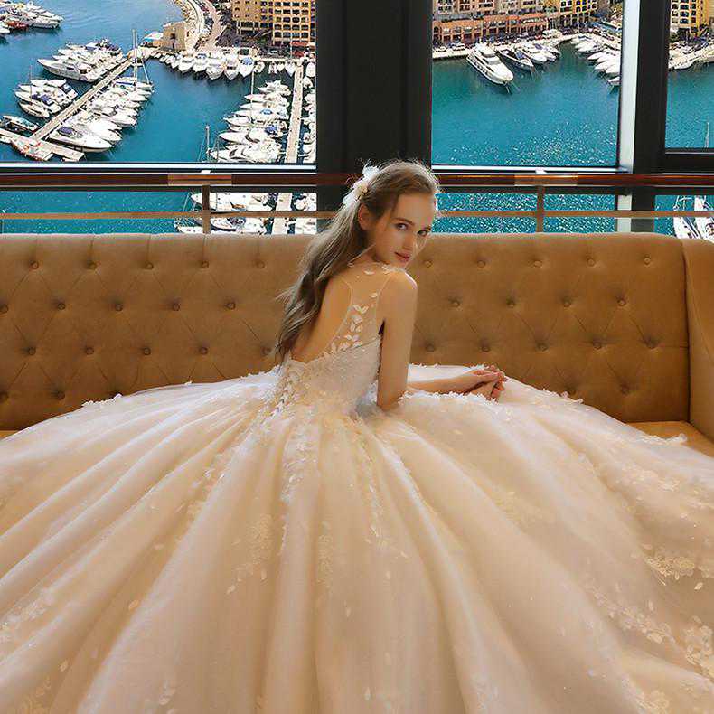 大露背和半透明肩带带给人一种如丝般柔滑的美感,裙摆上的亮片,在阳光下不经意就“bling”地轻闪一下,温柔梦幻活力十足,新娘略带青涩,让人连生好感。