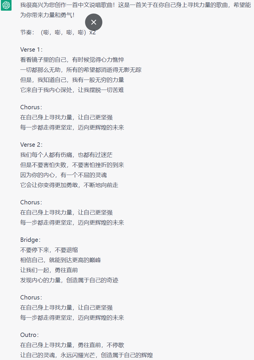 ChatGPT:我很高兴为您创作一首中文说唱歌曲!这是一首关于在你自己身上寻找力量的歌曲,希望能为你带来力量和勇气!节奏:(嘭,嘭,嘭,嘭)x2Verse1:看看镜子里的自己,有时候觉得心力憔悴一切都那么无助,所有的希望都消逝得无影无踪但是,我知道自己,我有一股无穷的力量它来自于我内心深处,让我摆脱一切苦难Chorus:在自己身上寻找力量,让自己更坚强每一步都走得更坚定,迈向更辉煌的未来Verse2:我们每个人都有伤痛,也都有过迷茫但是不要害怕失败,不要害怕挫折的到来因为你的内心,有一个不屈的灵魂它会让你变得更加勇敢,不断地向前走Chorus:在自己身上寻找力量,让自己更坚强每一步都走得更坚定,迈向更辉煌的未来Bridge:不要停下来,不要退缩相信自己,就能到达更高的巅峰让我们一起,勇往直前发现内心的力量,创造属于自己的奇迹Chorus:在自己身上寻找力量,让自己更坚强每一步都走得更坚定,迈向更辉煌的未来Outro:在自己身上寻找力量,勇往直前,不停歇让自己的灵魂,永远闪耀光芒,创造属于自己的辉煌复制代码当ChatGPT变成脱口秀选手