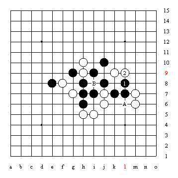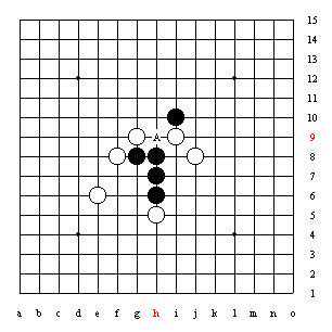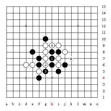 上图中很明显A点黑棋四三胜,现在告诉你:要想防住这个四三胜点,一共有十三个防守点。问题是:请你把它们一一找出来!当年,日本五子棋代表团来我国访问时,日本五子棋代表团在中国棋院就出了这道题目,当时是中国棋院原院长陈祖德老师,首先算出了答案。