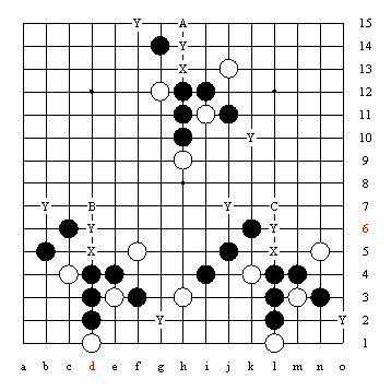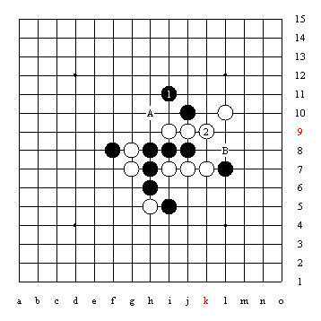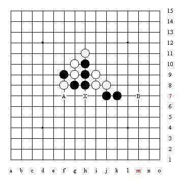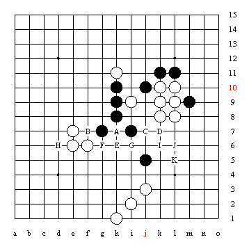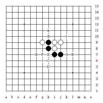 X点是三三禁手,要想化解掉这个禁手共有十个点,其中A至F是使X点成为四三点,G至J是由于这两个三都是跳活三,从而利用长腐的解禁技巧。黑棋下在K点虽然没有解掉禁手,但能使X点所在的阴线上,白棋的眠三下一步不能冲四而很容易抓到黑棋的禁手。