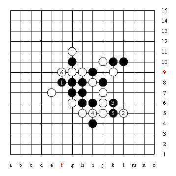 图5黑1解禁并蕴涵杀着,白2、4利用冲四防守,白6再防黑棋上面的杀成功。