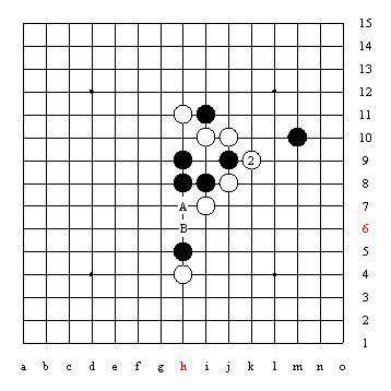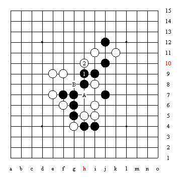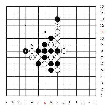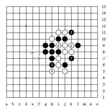 图中的A、B两个点是利用了长腐,化解了黑棋X点的禁手。当然黑棋还有G6、H6两个跳冲四使X点禁手化解的做法。