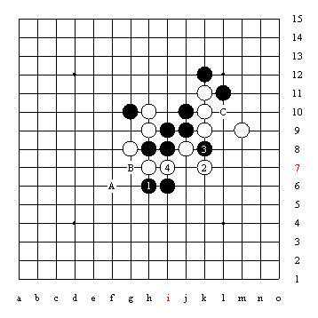 图12白2和白4使黑棋A点四三因遭到白棋反冲四而不能取胜,迫使黑棋不得不由进攻转而在B位和C位防守。
