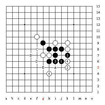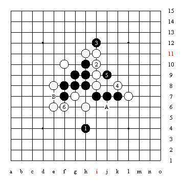 图6黑1做四三杀,白2不能在黑3位冲四做交换,只能防住黑棋的四三胜点,这时白棋在5位和3位出现两个胜点,必须先在3位利用冲四防守,再在5位反活三,白6只能防在黑棋活三的上方,否则黑将走6、A四三胜。