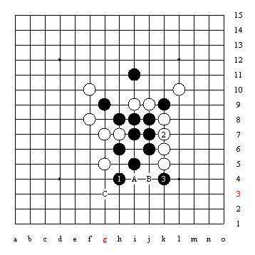 图1是白棋单纯防守活三,白2必走,否则黑则在此点四三胜,这种活三防守极具方向性,必防在有四三胜的一侧,是一种非常基本的也是最为常见的一种情况,请初学者务必掌握熟练。白4是防黑棋跳活三,共有A、B、C三个防点,这三个防点由于防点的不同将有不同的变化;初学者往往只是容易选择在B点防,而忽视了A点和C点,虽然很多情况下防中间B点是最强的,但也有一些时候防A点或C点是最强的,这是连珠五子棋初学者应该引起注意的。
