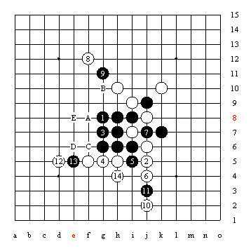图26黑1走错,应该走在2位。结果导致黑3时,白4、6、8、10、12走完后。这时A点和C点都成为四四禁手点,B点由于长腐也不是冲四了;白走14使黑棋D、E的进攻由于反杀而失败,从而使白棋主要利用禁手的方法防守成功。