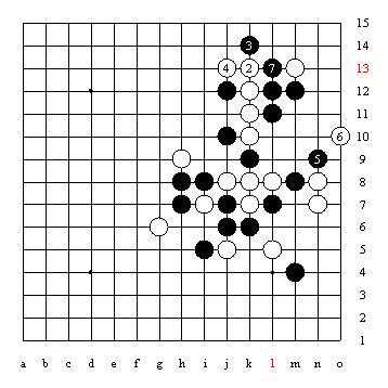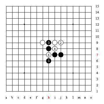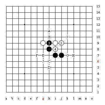 对于跳活三,一般情况下防在中间最强。但也不都是这样,上图中白2若防在5位,黑棋则在J8点速胜;因此这时就要防在现在白2防的位置,即跳活三的一侧而不是中间的5位。这只是一个小例子,从中可以看出实战中我们必须根据实际情况经过计算来判断落点,而不能死板的套用理论中的一般情况或自己凭‘想当然’落子。