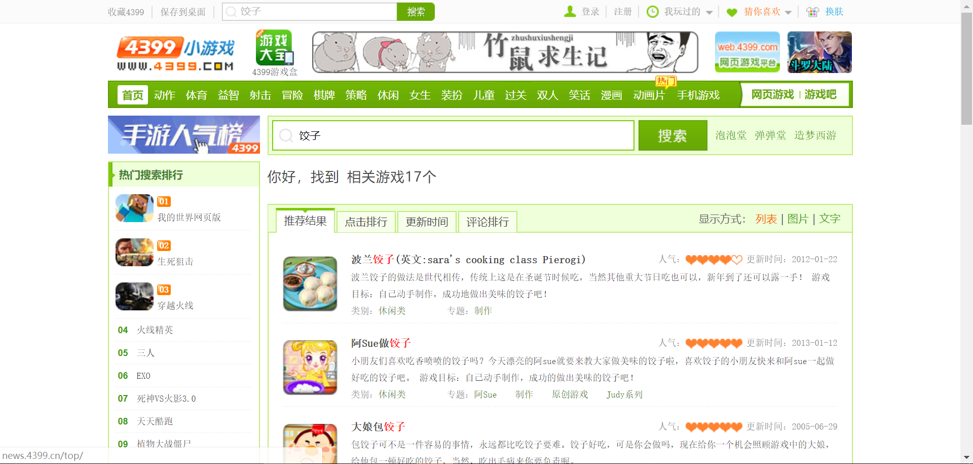 话说回来,米游君虽然经常玩游戏,但在游戏里确实没怎么干过做饺子这么Chun……这么贤惠的事情,所以在找合适的游戏时真的是抓破了头皮。为了小试身手,米游君毫不犹豫地点开了4399,并输入了关键词“饺子”。