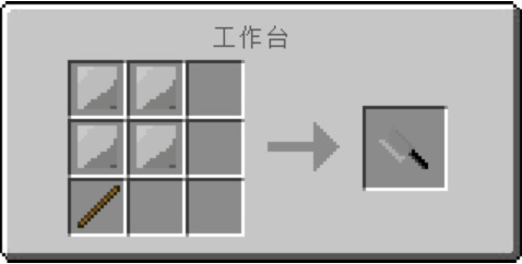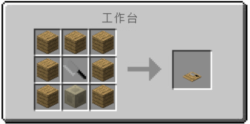 做完菜刀,将菜刀与7个橡木木板与1个稻谷机器外壳如下图摆放在工作台中,即可做出菜板: