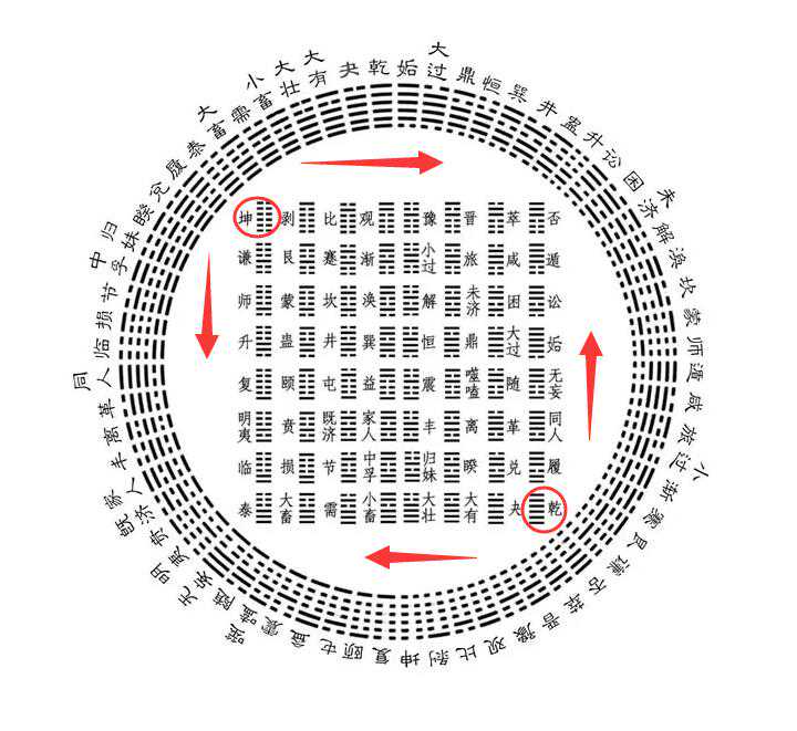 第一横行与第八横行下卦分别为乾与坤,表”天地定位”,不过其乾坤方位与圆图形恰相反,表天地正反交接;