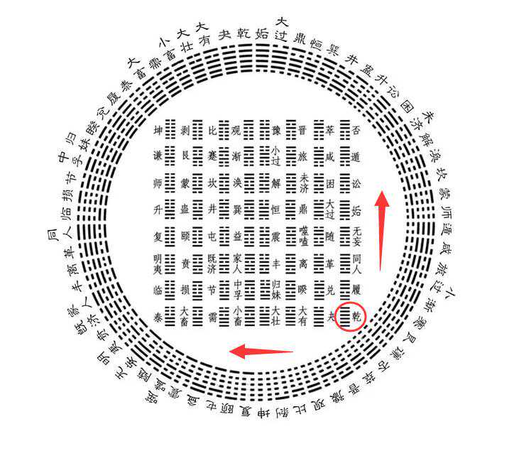 这是在找方图里卦序的排列规律,我们从右下角的乾卦出发,查找其排列轨迹。