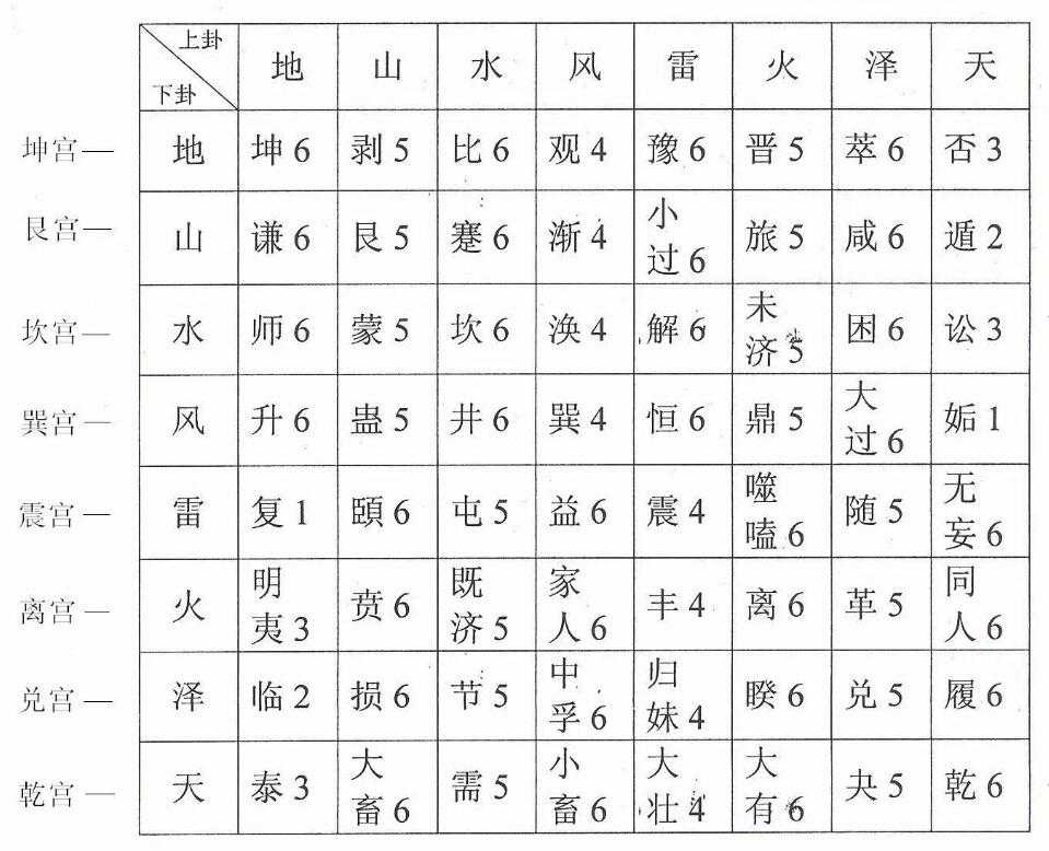 从下横行向上横行看,共八横行,依次为乾一宫八卦至坤八宫八卦,每行下卦皆为该宫卦: