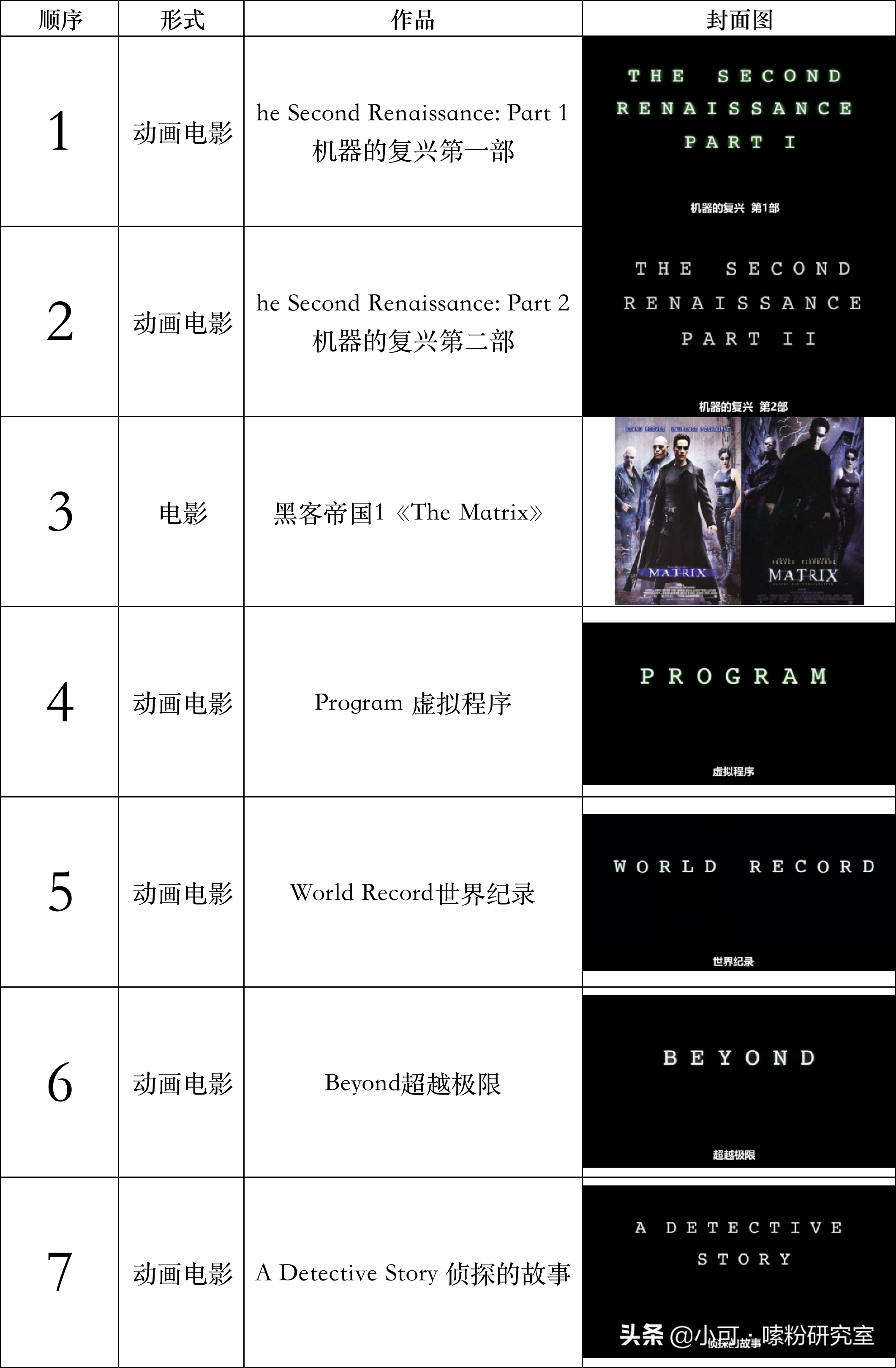 最后剩下的动画版《Program虚拟程序》《WorldRecord世界纪录》《Beyond超越极限》《ADetectiveStory侦探的故事》《Matriculated矩阵化》可以在看完电影《黑客帝国1》之后,在看《黑客帝国2》之前进行观看。