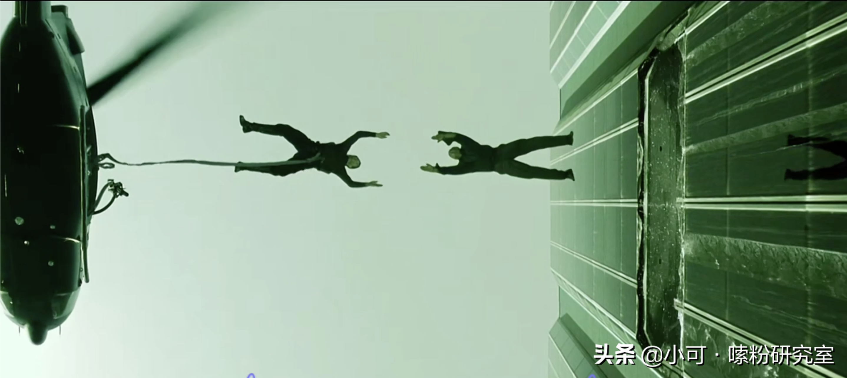 为了尽快找到Morpheus,Neo和Trinity借助电梯的反向拉伸和爆炸,来到了楼顶,并在此上演了最经典的“子弹时间”戏码,但还没有完全掌握这项技能的Neo,帅不过三秒久就倒地了,好在有Trinity补枪救援。
