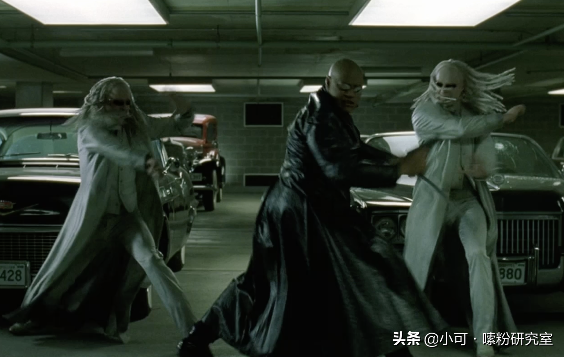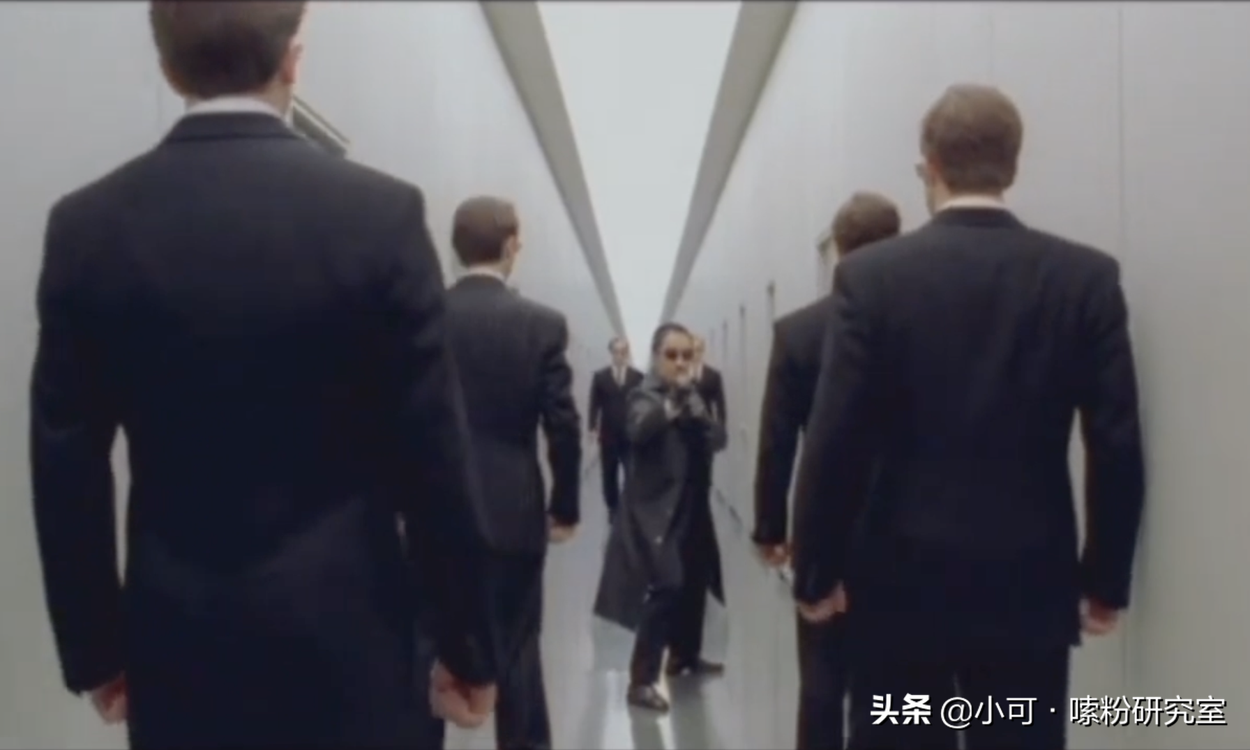 正当Smith给Morpheus宣讲他所悟到的“人类病毒论”,并摘下耳机,暂时脱离和矩阵母体的连接,告诉Morpheus自己真正的想法——寻求真实时,Neo和Trinity已经身着黑色风衣,全副武装,用一阵酷炫吊炸天的枪战和格斗技杀入特工大楼总部,如入无人之境,大杀四方。