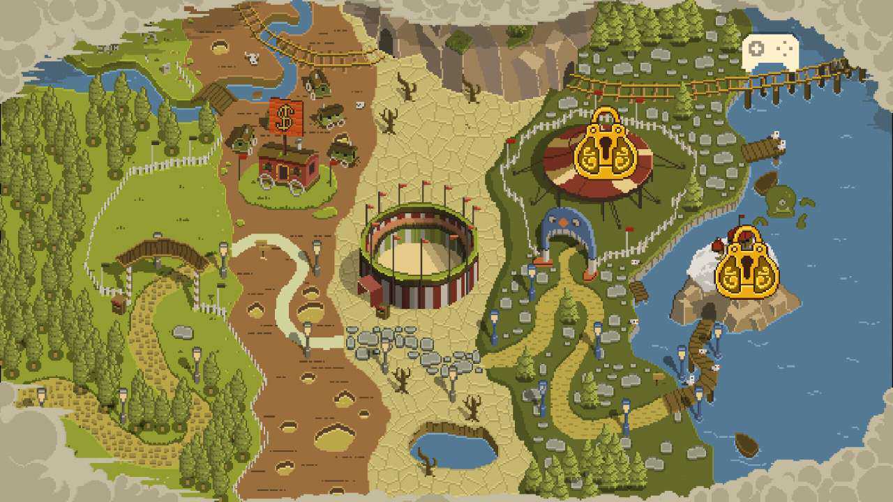 游戏嘛,讲真看起来是很简单的,首先要通关的是屏幕正中央的马戏团,一共分为十关,主人公要通过在台子间跳跃以采集箱子,掉下台子就没有命了,场面一度很血腥,心脏不好的朋友要慎入。第一关是用来掌握基本操作比如二连跳以便于在各个台子之间移动,相对而言还是比较容易通过的,第二关开始加入障碍,上面会有一个炸弹,主人公要在收集箱子的同时要躲开这些致命的障碍,而随着关卡数的增加,主人公的生存危机越来越大,对操作者灵活的要求也就越来越高。