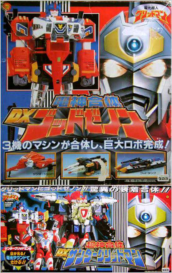 ▼1993年TAKARA【电神合体DX战神斯昂GodZenon】,与配备「电光超人」的豪华版「超神合体:雷鸣古立特ThunderGridman」。