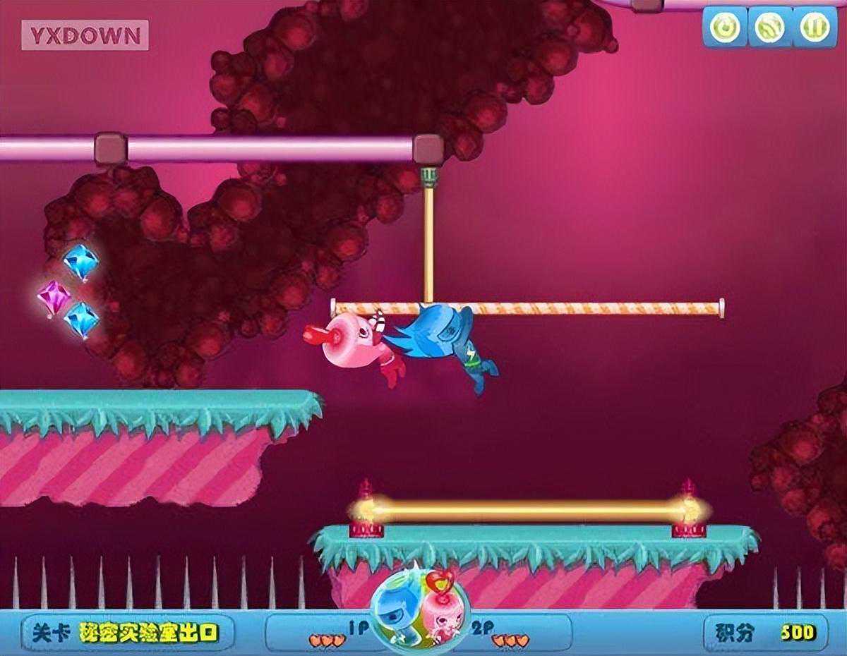 还有一款《闪翼双星》,也是我和小伙伴经常用来打发时间的双人游戏~里面的角色分别是闪和翼,那时候很喜欢玩翼,因为她会飞能轻松滑翔跨越不少障碍物。不过闪也蛮强的,站着不动就能进入隐身无敌状态。虽然游戏只有八个关卡,但对当时的我们来说还是很有挑战难度的,有时候打不过就只能玩破解版爽爽……小声逼逼,某99某7k的破解版、无敌版小游戏真是数次拯救了当年手残又无助的我们……