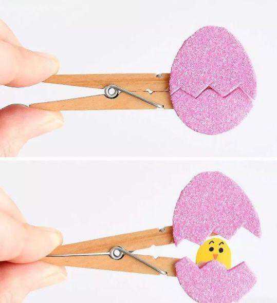 在木夹的上下两端涂上胶,把蛋壳两部分粘在木夹的上下两端,把小鸡粘在木夹另一侧。
