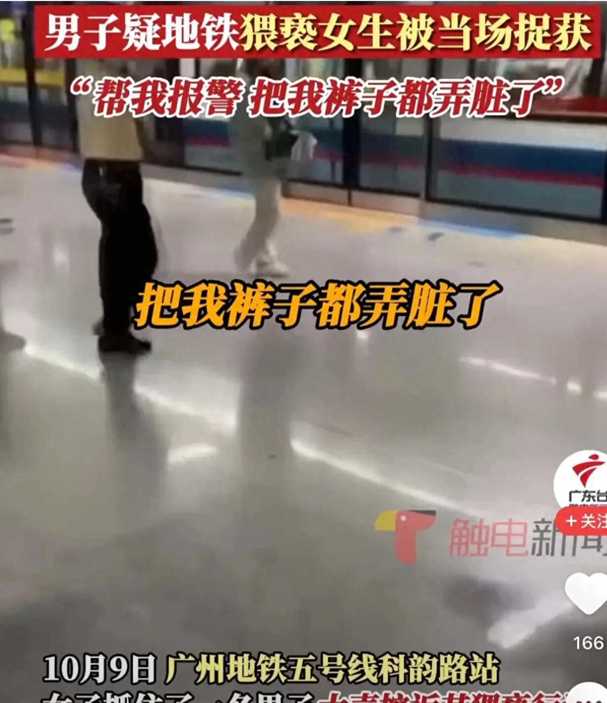 10月9日上午9时许,一名女子在广州地铁五号线上被一名男子猥亵,裙子上有不明液体,被女生当场抓住了,那男的还在拉裤链。这是怎么回事?