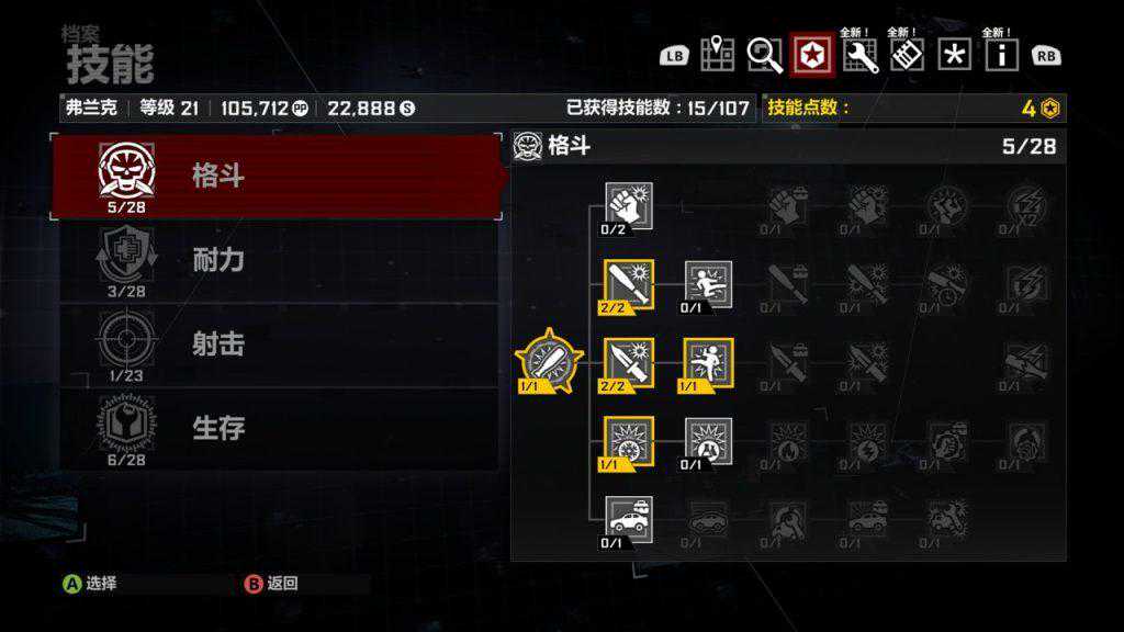 当然我们的主角也不是一成不变的,游戏中设有等级系统,通过做任务、杀僵尸来积攒经验值,然后在提升等级后获得技能点,接下来再利用技能点在格斗、耐力、射击和生存四个子类别中按照自己的需要强化能力。