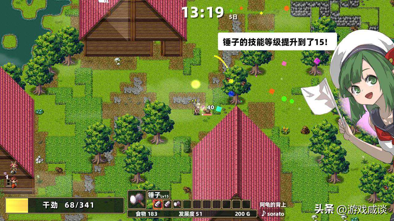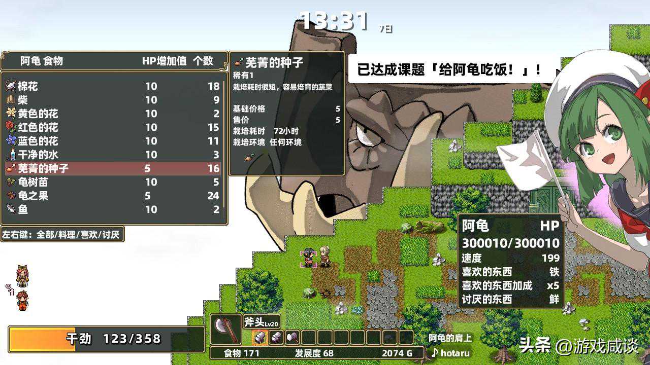 我们在安顿好招募来的冒险者之后,就需要为村庄的生产建设劳神费力了。耕地种菜、进洞挖矿这种都需要我们主角亲自去做,这些也是基本的生产生活资料的重要产出途径。由于是键盘操作,这种日常活儿干起来格外地“肝”。以种地为例,除草、犁地、播种、浇水,这些操作都需要我们主角一个格子一个格子地进行操作,键盘操作的时候转身还十分麻烦,因此游戏体验是很累人的。不过游戏的机制倒不难理解,基本上就是农场模拟经营类游戏的那一套系统。