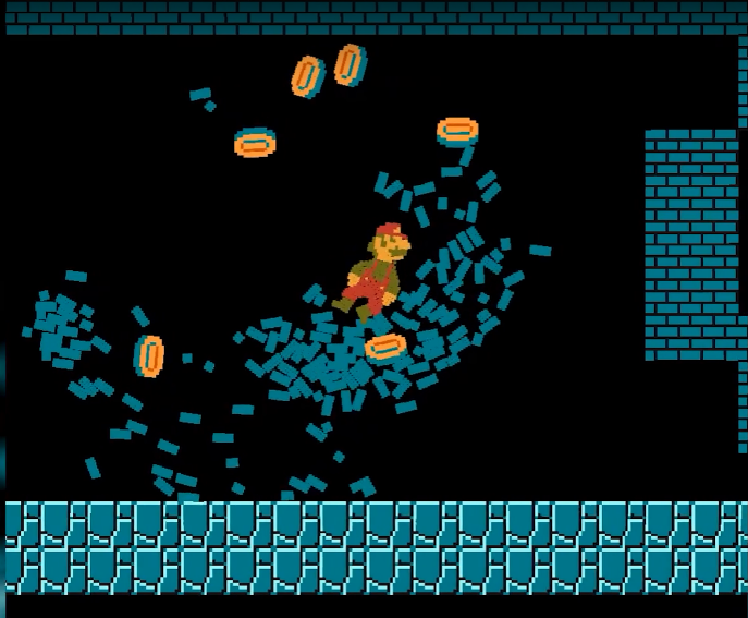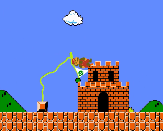 游戏内马里奥可以如同果冻一般扭曲蠕动,而且只能由脚触碰地面,否则的话,你的头会卡在任何奇怪的地方,动弹不得。