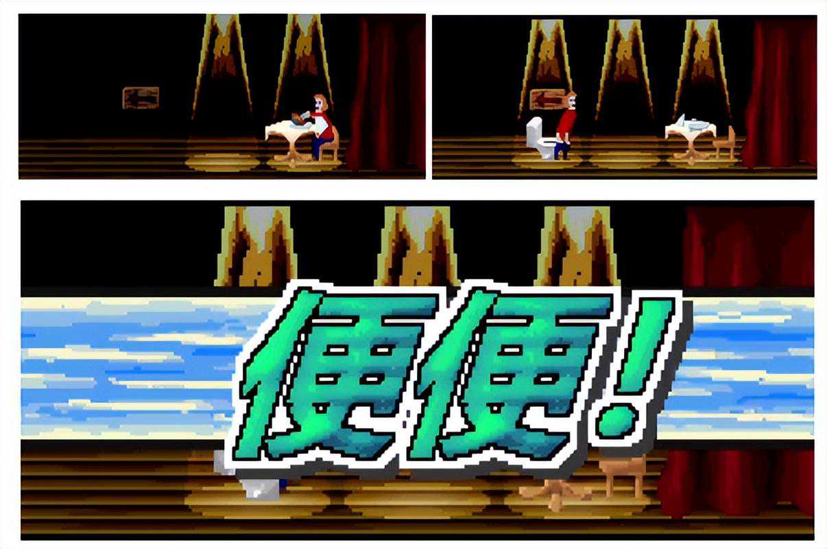 首先,像素哥从天而降,掉落至一个小房间。接着你将面临一颗炸弹,拾起后,左上角显示30秒倒计时,烘托出紧张气氛。这时面前亮起一盏聚光灯照在餐桌上,怎么,坐下来试试?于是主角坐下,拿出刀叉一口口吃下了炸弹?!接着一座马桶也适时亮起,怎么,坐上去试试?“咕咚”一声——世界居然就被拯救了?!看着像素哥被冲上云霄、掉落至一座城镇,《像素哥3》的正片也就开始。