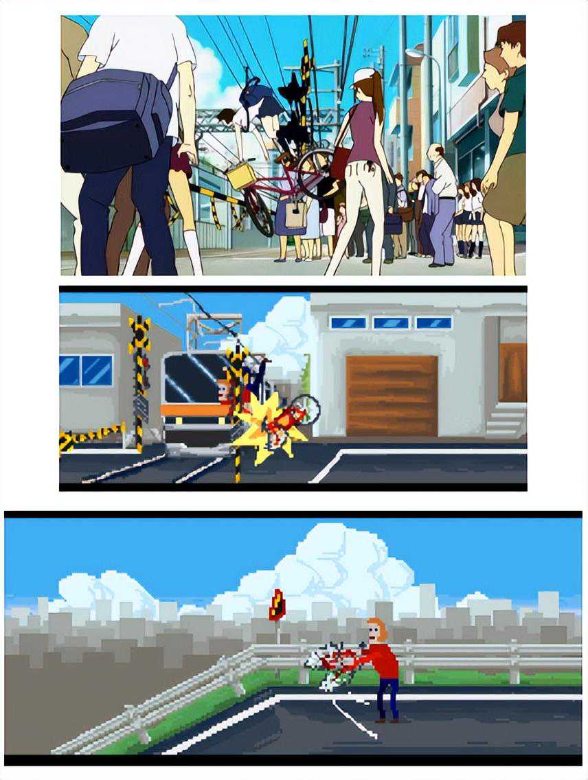 或许像素哥的不按常理出牌,能让《泰坦尼克号》的男女主都不必生离死别。比如他可能就想好了怎么改写《穿越时空的少女》里某个下坡路坏结局:为了不和即将经过的火车撞在一起,像素哥选择直接甩掉自行车。