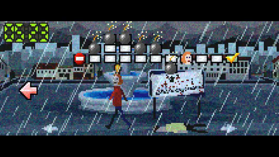 这种限时反应玩法看似有些像《瓦里奥制造》,但《像素哥3》里不存在真正的死亡,只有真正的“坐牢”。因为每段旅程,在拯救完所有坏结局之前,未通过的关卡都将循环播放,这时玩家会感到非常着急,比如我就卡在某个关卡近两小时。玩家也只有等到真的“拯救世界”,才能看见像素哥贱兮兮的胜利姿势。