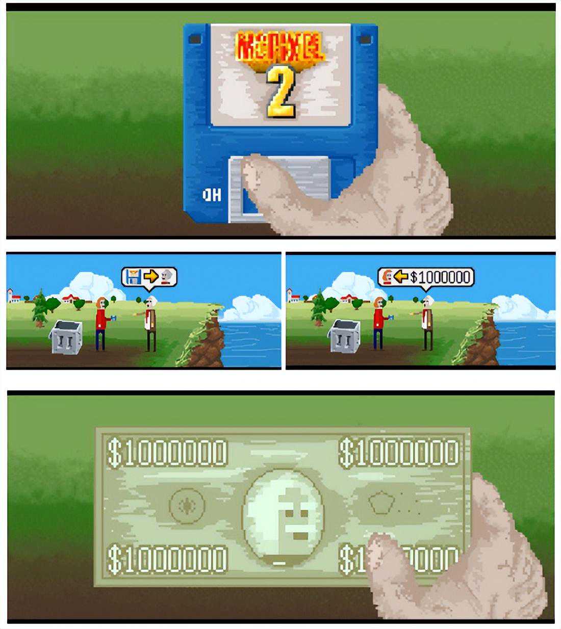 玩家在游戏里的确能感到“真金实银”的快乐和作者的慷慨。谁能想到那部被跳过的《像素哥2》居然作为游戏彩蛋出现了,而它竟为玩家带来百万美金的收入。