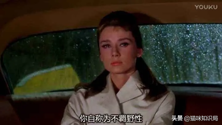 电影中,在赫本与猫的互动中,最让人印象深刻的就是那一幕“雨中扔猫”。赫本所饰演的女主角万念俱灰之下,打算坐飞机去巴西,她在漂泊大雨中,将一直与她相伴的橘猫赶下了车,面对满目疮痍的生活,她选择了自我放弃。