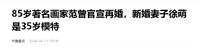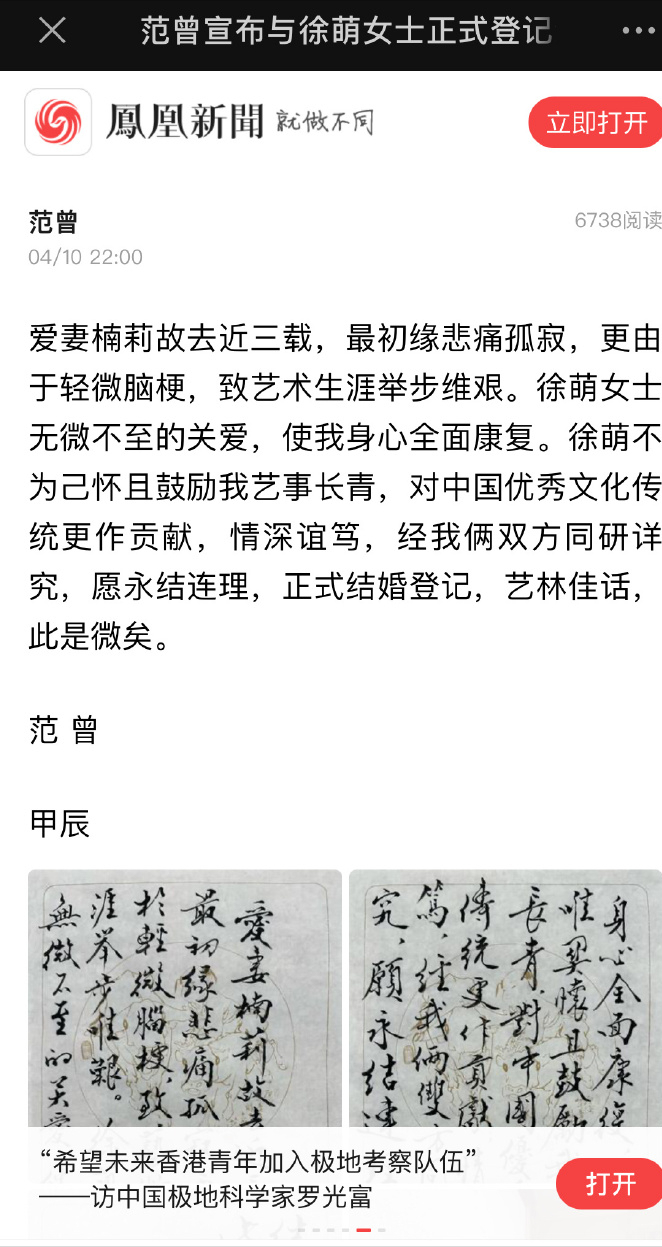 凤凰新闻2024年4月10号——范曾宣布与徐萌女士正式登记结婚