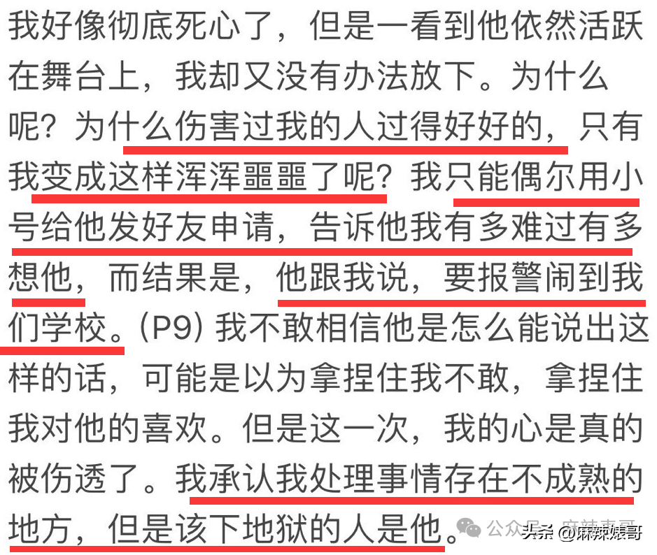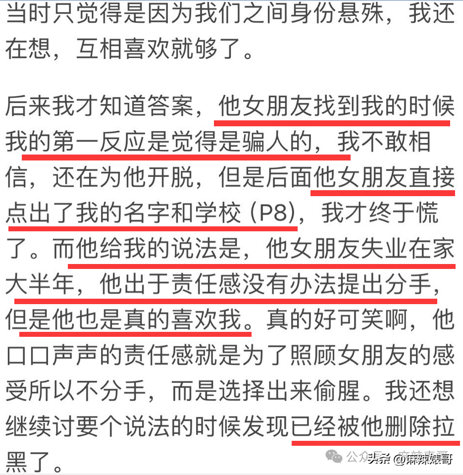 说自己在毫不知情的情况下被三,想讨要说法被杨波删除拉黑并被威胁封口。