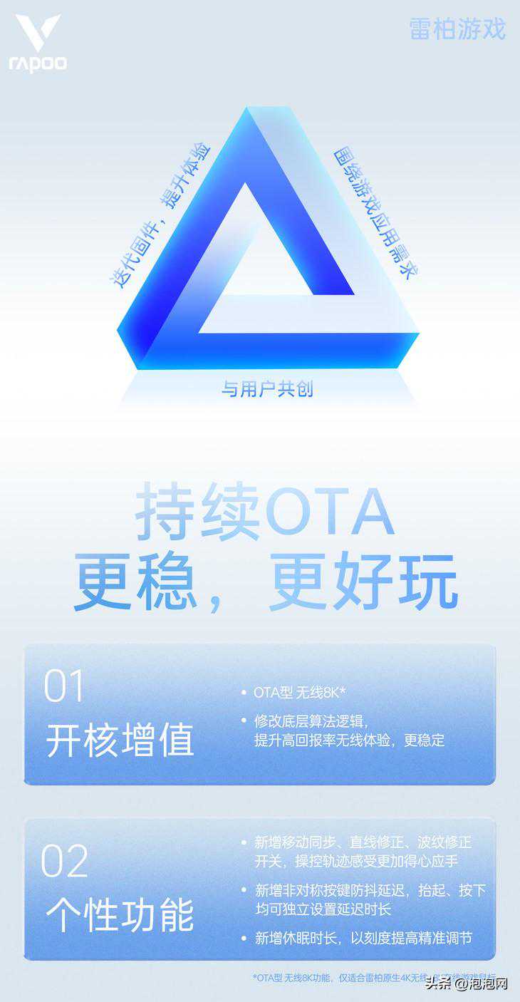 在“高回报率”的共识基础上,另一个竞争坐标系就是这项功能的稳定性以及续航性。雷柏原生4K无线+8K有线游戏鼠标的用户体量是持续领先的底气。持续OTA,对用户可以说是持续性受益。从产品立项,到上市,雷柏不断发掘芯片潜力、优化底层算法,全新鼠标110、接收器109的固件,可以说是“重新修缮”,V+无线技术智能算法极大层度提高了高回报率无线体验稳定性,并完成了硬件更多功能的扩展。