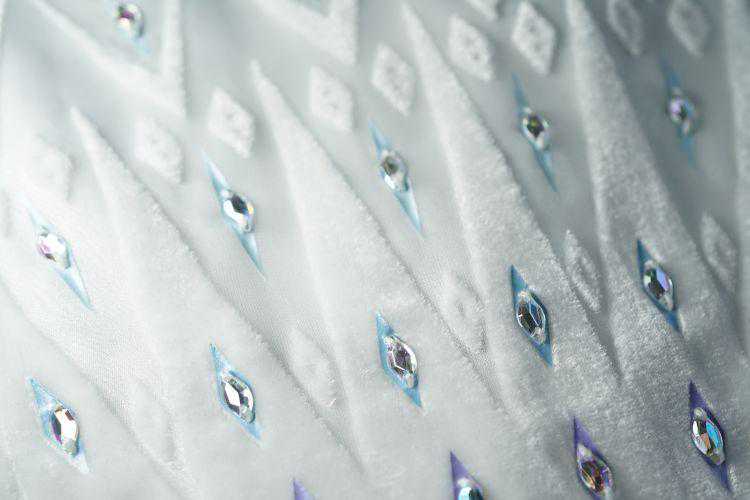 以上两大特点当然还远远不能代表迪士尼精雕细琢的诚意,礼服裙还在胸前和下摆处完美嵌入了菱形图案,呼应着风、火、水、地四大自然元素,不但与电影剧情相契合,细节更是做到满分!胸前的菱形添加了亮片的设计,使得裙子在哪种光线条件下,都能闪烁耀眼的光芒。薄纱的袖子上还绣了精美的冰晶,还原度百分百!
