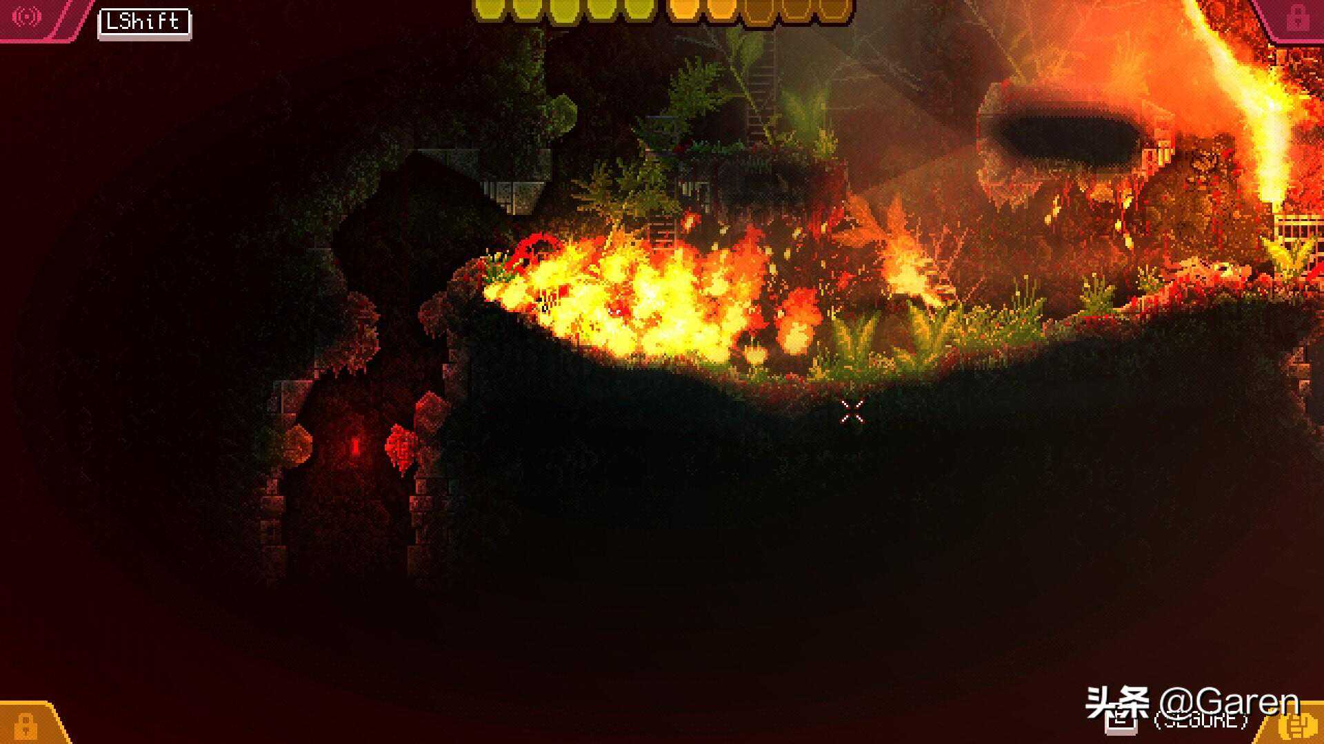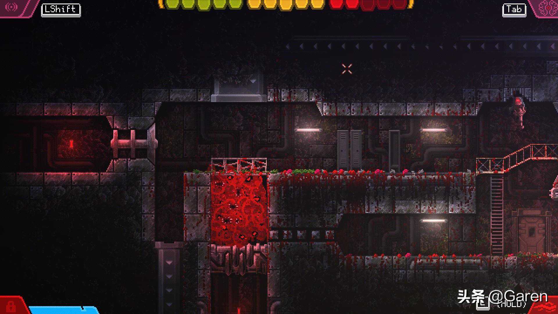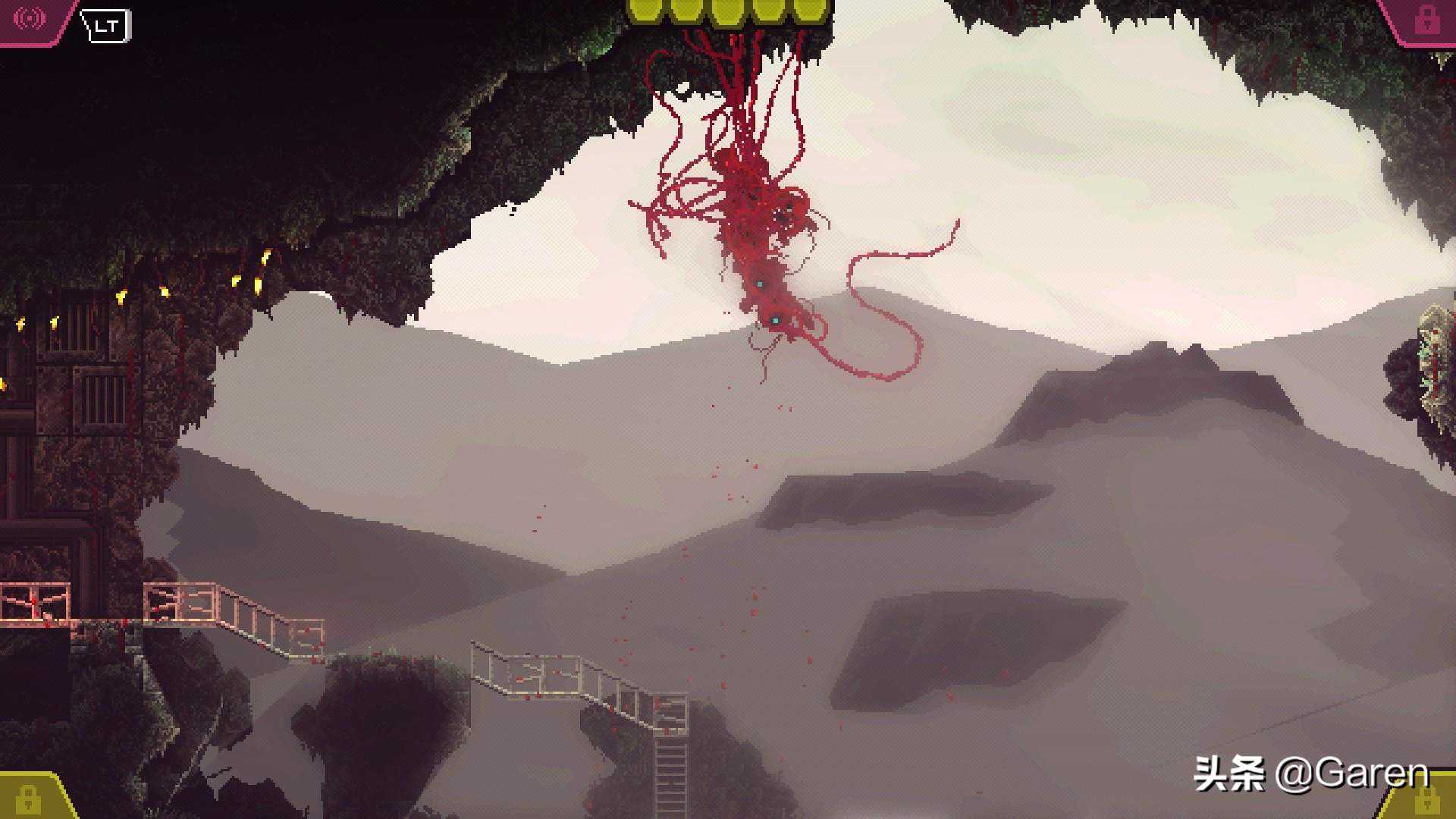 近年来像素游戏的画面都偏向高清晰度与精致方面进行,本作也不例外,特别是主界面不断蠕动(个人主观感觉更像是“舌头”hah)的触手画面制作的超棒,主界面算是本作猎奇向的体现精华所在了,反倒了游玩过程因为像素画风而显得不够血腥与恐怖,你所能看到的怪物仅仅只是一个“浑身长满触手,没有固定形态的红色生命体”,行走时的整体触手抓握、喷射、滑移、缠绕等等动作所产生猎奇感还没存档点动画互动给我带来的感觉强烈。