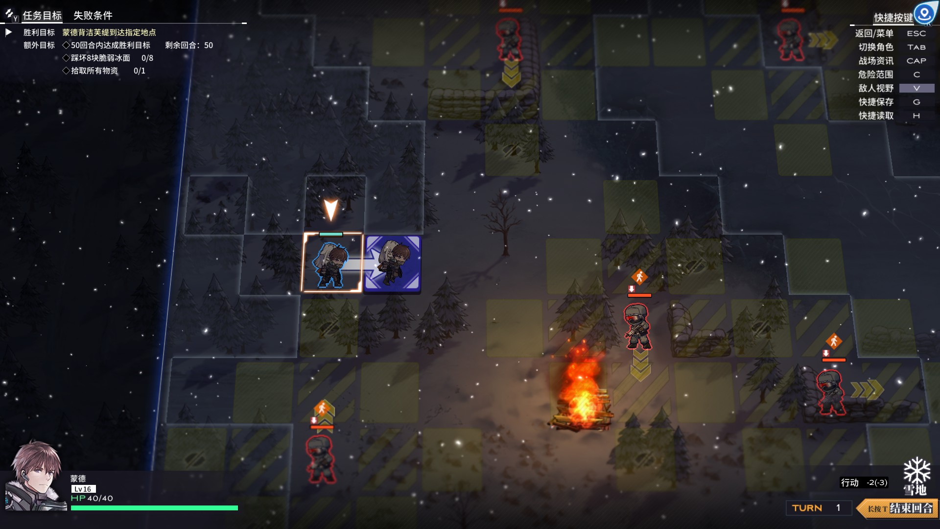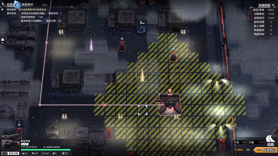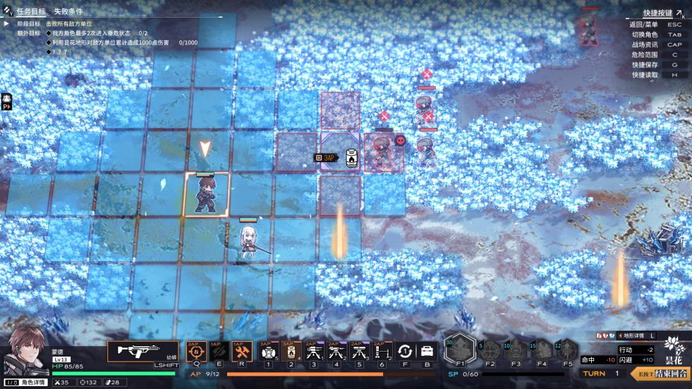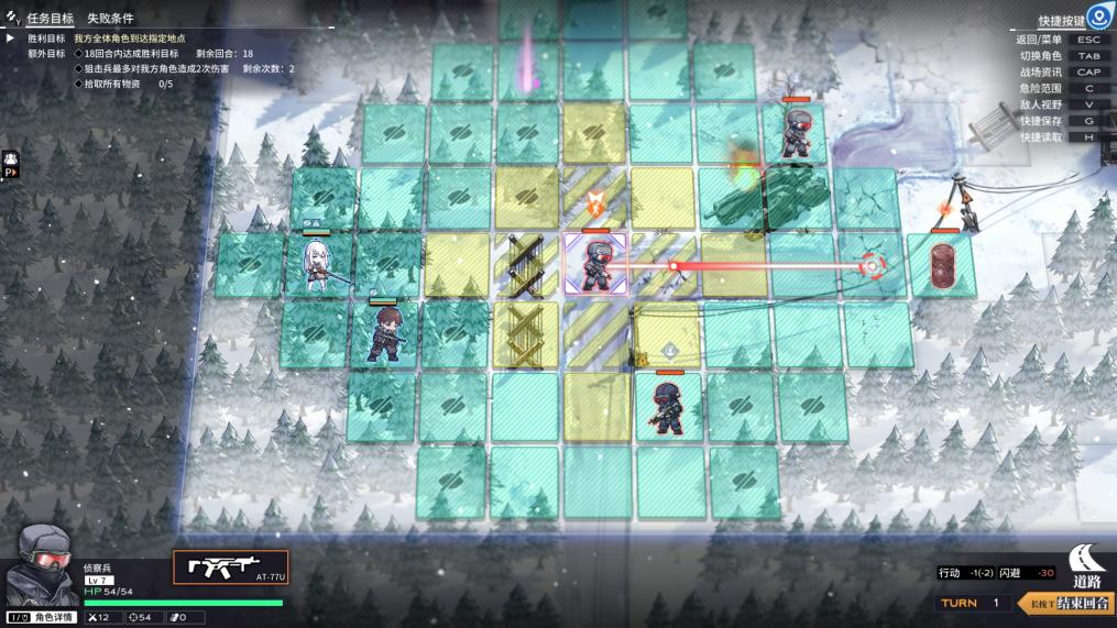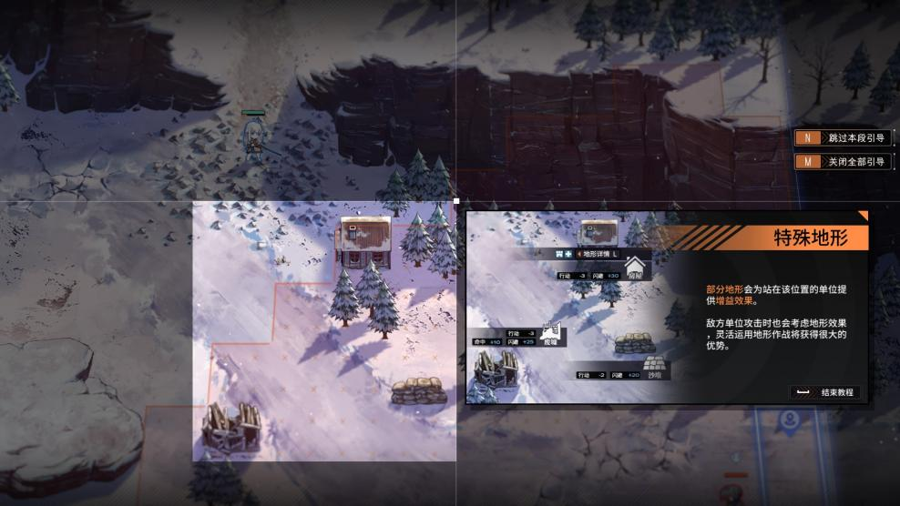 在此基础上,地图中的地形也会对战局有所影响,不同地形拥有不同效果。地图中有松树、房屋等作为掩体,有的掩体可以增加闪避,有的则是会增加角色的攻击命中,还有增加防御或者视野。事实上,游戏里每个关卡都设计了多样的地形,这使得游戏战术的选择也非常多样。
