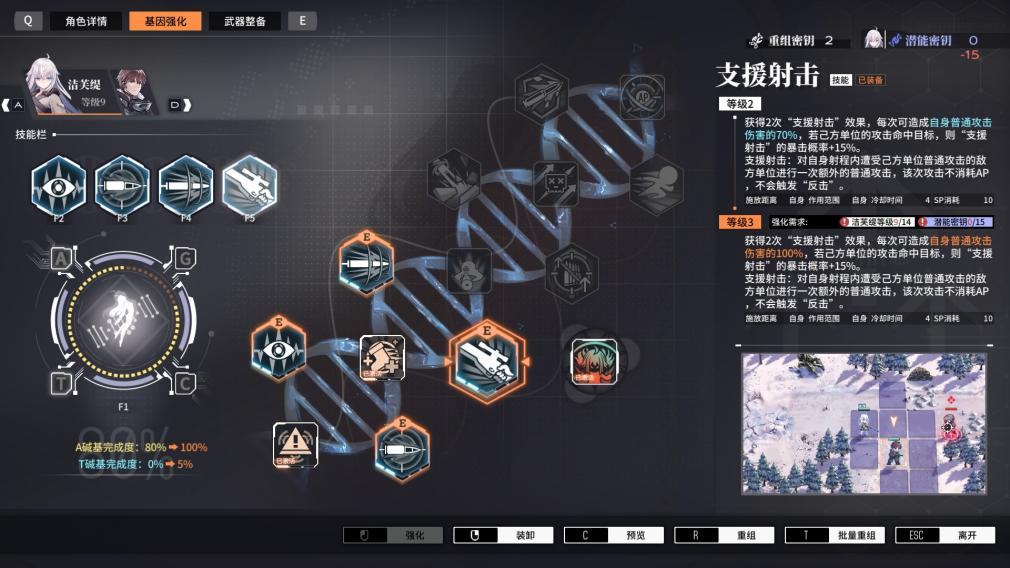 更加完善的角色养成角色养成方面主要以武器强化和改造,以及角色的基因组技能强化组成。基因组技能分为通过消耗击败敌人所积累的技能点数来释放的主动技能,和各种常驻效果的被动技能。