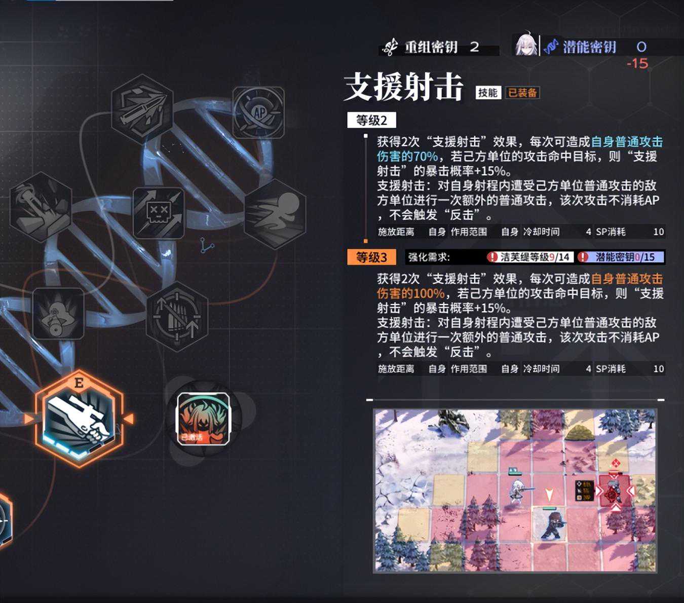 技能的效果五花八门,比如“沉稳射击”是攻击强化60%这样简单直接的buff效果,而像“支援射击”则是对友方攻击进行追击的特殊功能,还有像回血、复活、加速等泛用性良好的技能。