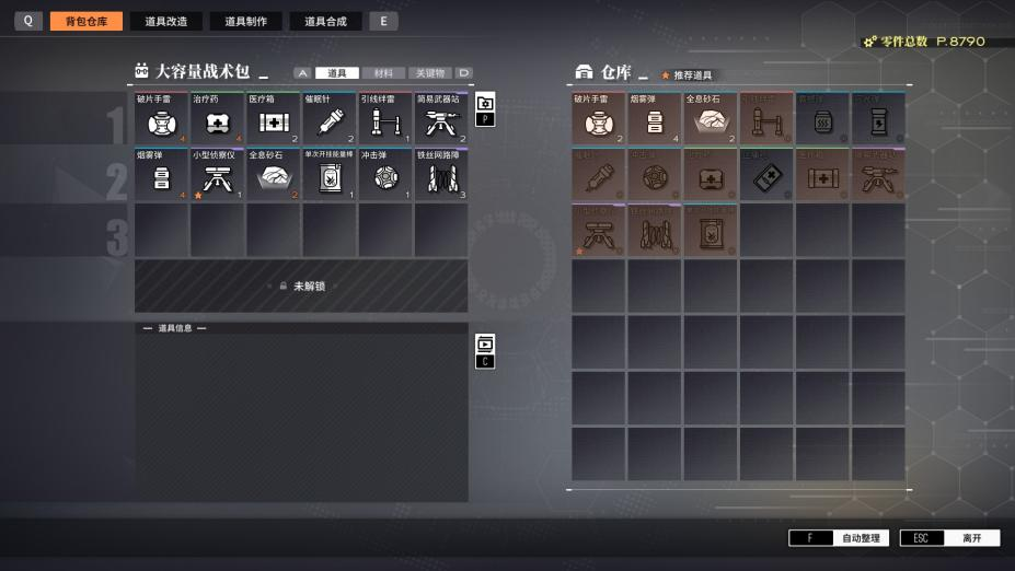 除此之外,在整备阶段还可以对进行战斗中获得的物资进行分配,然后制作关卡中需要使用的道具。道具制作的类型很丰富,我们可以合成例如手雷、烟雾弹等投掷道具,止痛药、医疗箱类的恢复道具,或者是侦查仪铁丝网路障等等为战斗提供便利的物品;