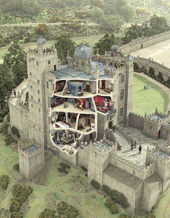 12世纪英格兰的一座城堡的复原图,它采用了石质材料,只有强大的攻城武器才能将它攻陷。