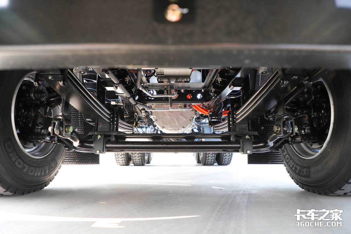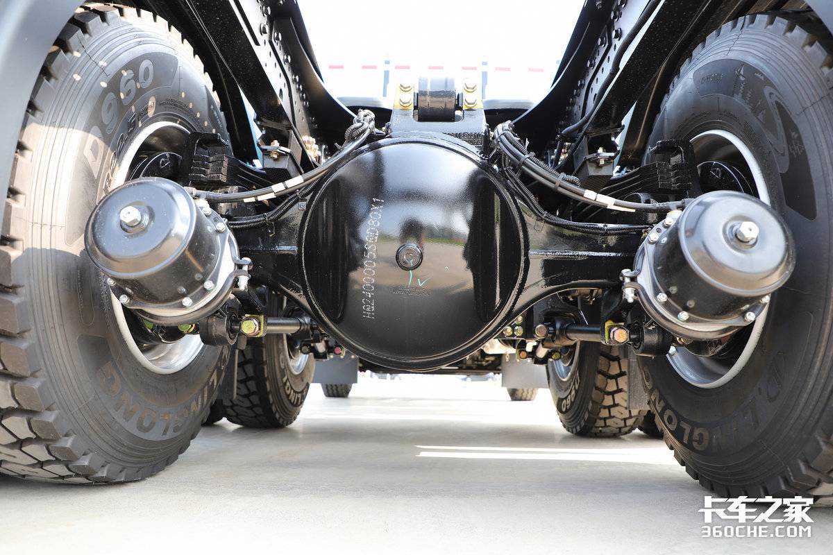 底盘零部件方面,车辆配备了三环7吨级前轴,后桥采用13吨级方盛469车桥,其速比为5.143。悬架采用前3后4的少片簧设计,车辆标配轴间差速锁和轮间差速锁,轮胎规格型号为12。